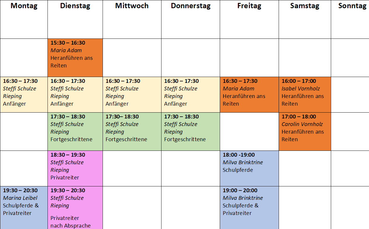 Zu diesen Zeiten findet Unterricht in der Reithalle statt. Das freie Reiten sowie das Longieren ist dann nicht möglich.